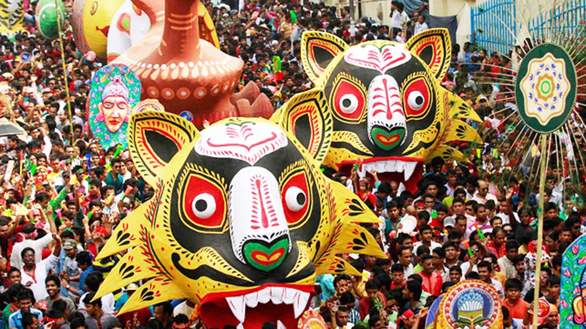 পহেলা বৈশাখের উৎসবের অন্যতম আকর্ষণ মঙ্গল শোভাযাত্রা। আজ রবিবার (১৪ এপ্রিল) সকাল সোয়া ৯টায় ঢাকা বিশ্ববিদ্যালয়ের চারুকলা অনুষদের সামনে থেকে শোভাযাত্রা শুরু হয়। শাহবাগ মোড় ঘুরে রমনা টেনিস কমপ্লেক্সের সামনে দিয়ে শিশুপার্কের মোড় ঘুরে আবার শাহবাগ দিয়ে টিএসসি চত্বর ঘুরে চারুকলা অনুষদের সামনে এসে শেষ হয় বর্ণাঢ্য এই শোভাযাত্রা।