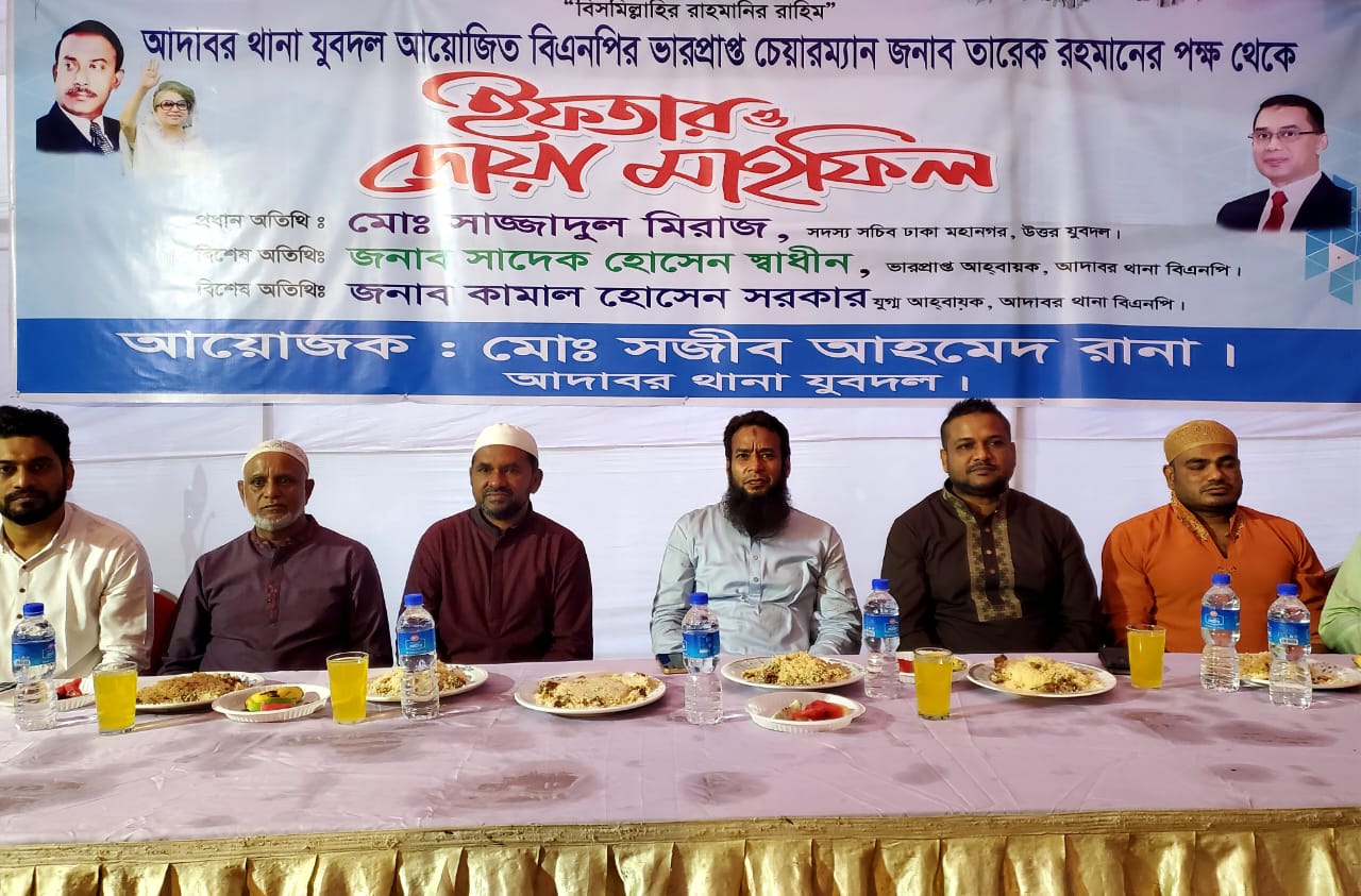 রাজধানীর আদাবরে বিএনপির ভারপ্রাপ্ত চেয়ারপারসন তারেক রহমান ও সাবেক প্রধানমন্ত্রী খালেদা জিয়ার রোগমুক্তির জন্য বিশেষ দোয়া ও ইফতারের আয়োজন করা হয়েছে। আজ বিকালে আদাবরের শেখেরটেক এলাকায় আদাবর থানা যুবদলের আয়োজনে সজীব আহমেদ রানার সার্বিক সহযোগিতায় এ অনুষ্ঠানের আয়োজন করা হয়। এসময় অনুষ্ঠানে প্রধান অতিথি হিসেবে উপস্থিত ছিলেন ঢাকা মহানগর উত্তর যুবদলের সদস্য সচিব সাজ্জাদুল মিরাজ। বিশেষ অতিথি হিসেবে উপস্থিত ছিলেন আদাবর থানা বিএনপির ভারপ্রাপ্ত আহ্বায়ক সাদেক হোসেন স্বাধীন, আদাবর থানার যুগ্ম আহ্বায়ক কামাল হোসেন সরকার । অনুষ্ঠানে বক্তারা বিগত সরকারের সমালোচনা করে বলেন, আওয়ামীলীগের মত একটি সন্ত্রাসী রাজনৈতিক দলকে আর কিছুতেই বাংলার মাটিতে অনুপ্রবেশ করতে দেওয়া যাবে না। শুধু হেফাজত , বৈষম্যবিরোধী ছাত্রসংগঠন, জামায়াত, বিএনপি নয়, দেশের সর্বস্তরের মানুষ ফ্যাসিস্ট সরকারের দলকে যে কোন বিশৃঙ্খলা করলে প্রতিহত করবে। বিশেষ করে দেশের যে কোন প্রয়োজনে যুবদল রাজপথে ছিল ,আছে ,থাকবে। এসময় বিভিন্ন শ্রেণি পেশার প্রায় ২ হাজার মানুষের মাঝে ইফতার বিতরণ করা হয়। পরে বিএনপির ভারপ্রাপ্ত চেয়ারপারসন তারেক রহমান ও সাবেক প্রধানমন্ত্রী খালেদা জিয়ার রোগমুক্তির জন্য বিশেষ মোনাজাত করা হয়।